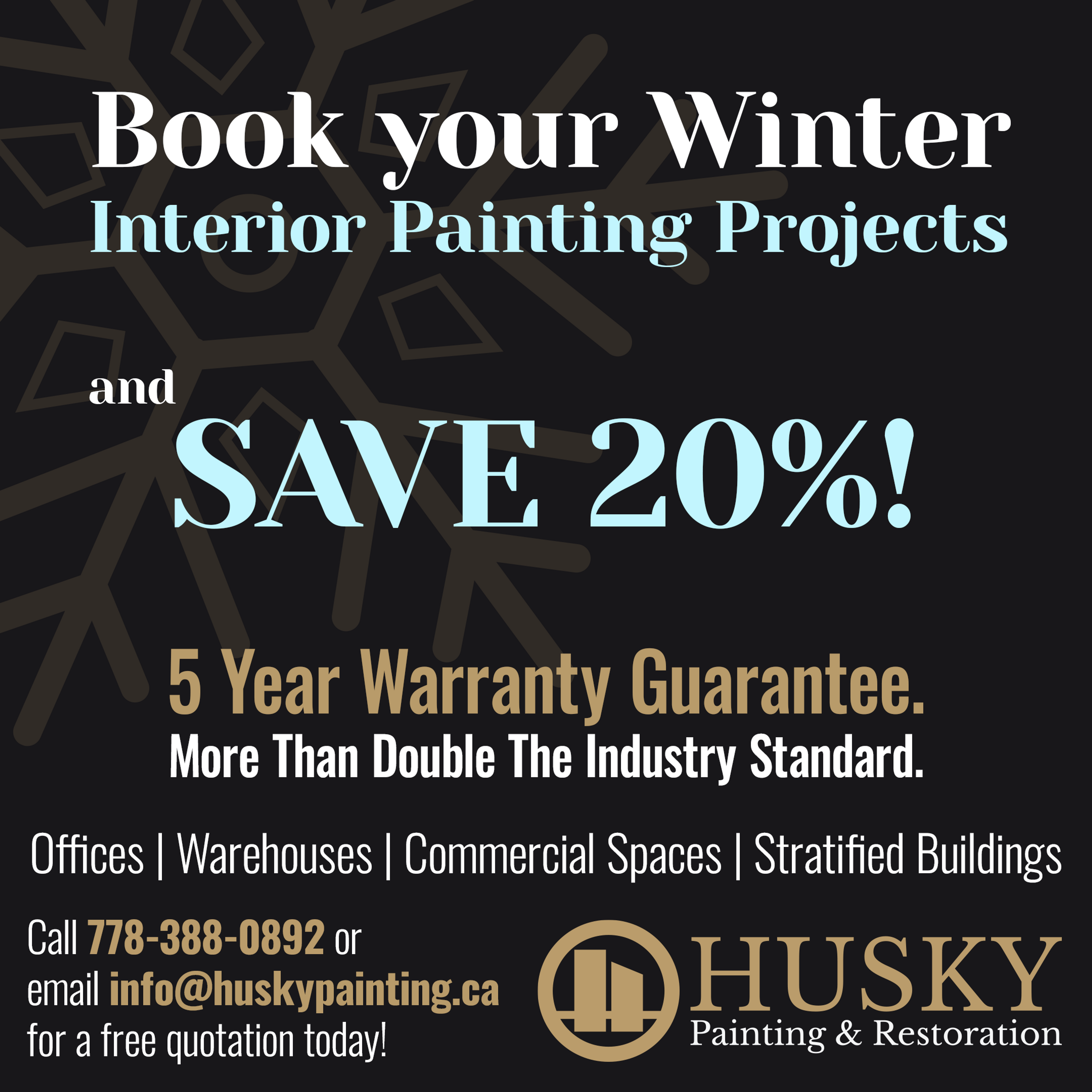 Give your property a stunning makeover with Husky's professional painting services. Take advantage of our winter discount for your interior painting project and save 20% off the quoted price. Projects will be scheduled between October 1st and March 31st.